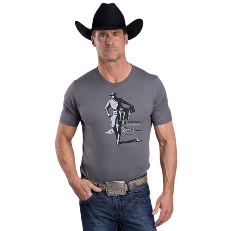 | Men's Grey Cotton Short Sleeve Jersey T-Shirt * Cover Stitched Collar And Sleeves * Pre-Shrunk * Vintage Black And White "Stetson The Hat Of The West" Cowboy Carrying Saddle Screen print On Front |
