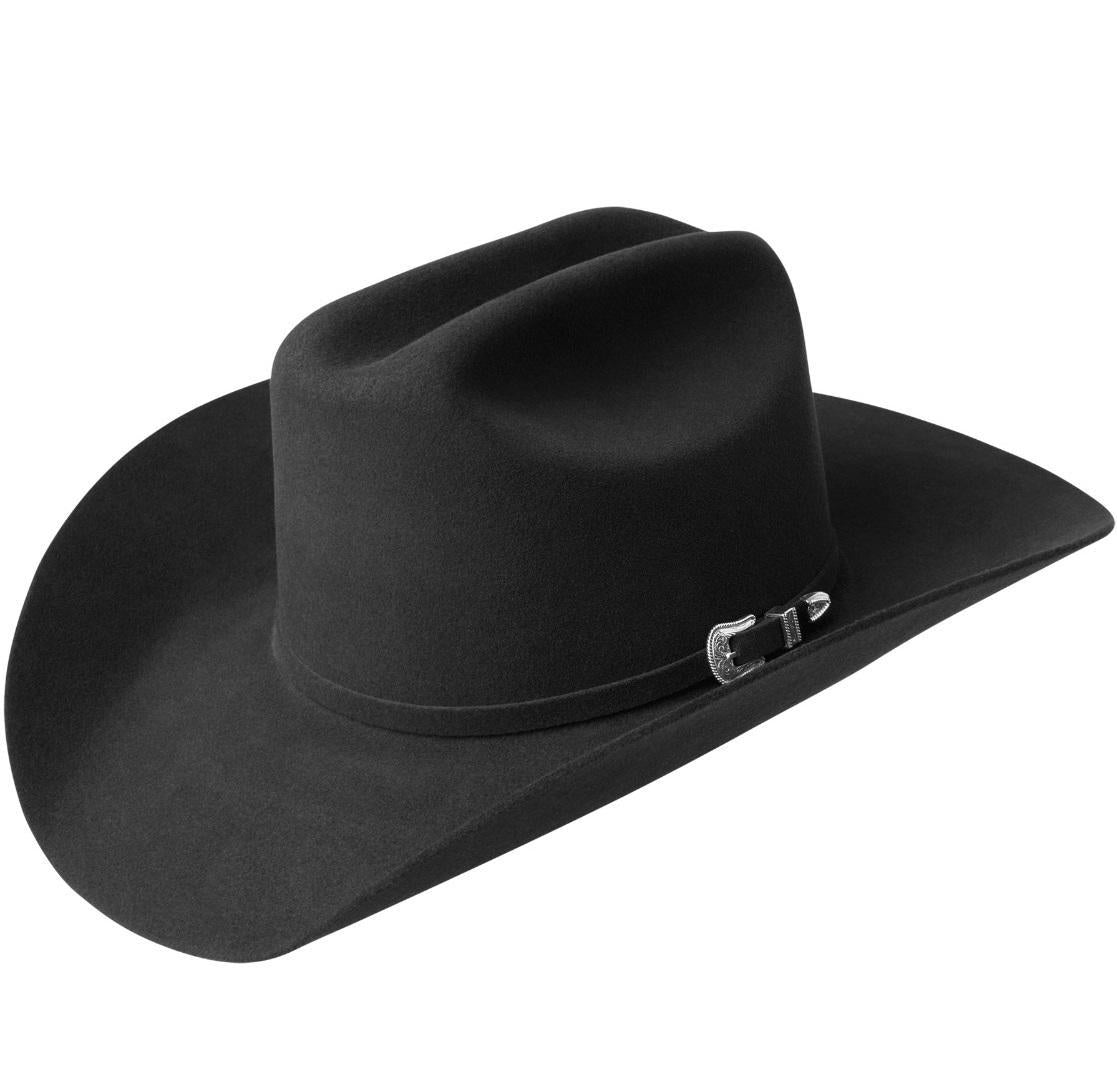 The Lightning 4x has a 4 1/2 IN Cattleman crown and a 4 INCH brim. It is made from a 4x wool and fur blend and is trimmed with a self-felt band and buckle set.