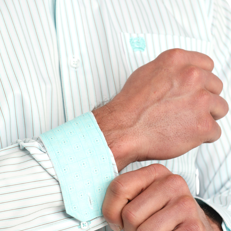 Cinch MTW1106061 Long Sleeve Button Shirt in classic white and sky blue stripe. This versatile western shirt features a traditional button-front design perfect for everyday wear. The long sleeves provide coverage and protection, while the striped pattern adds visual interest to your wardrobe. Built with quality construction for durability and comfort. An essential piece for any western wear collection.