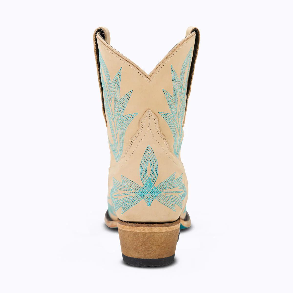 Embodying the essence of the coastal cowgirl, she embraces the vibrant energy of the shoreline in her design. Mirroring the shades of the beach, she is a captivating blend of a warm tan leather and a bright turquoise that injects a lively spirit into her classic snip toe profile. Her unique flame stitch embroidery, an innovative twist on the traditional, dances like waves under the summer sun.
