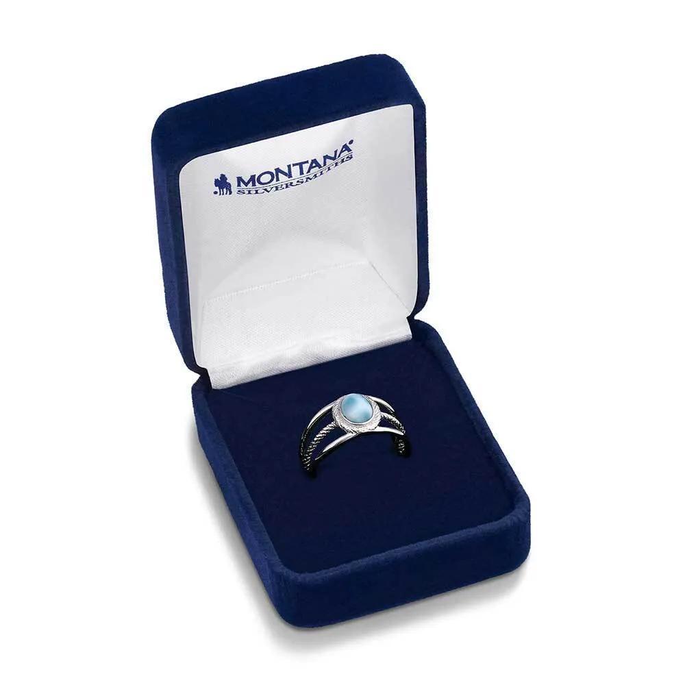 Find a feeling of calm with the gorgeous Peace & Serenity Open Ring. The center of the ring features a beautiful larimar stone that reminds us of clouds in a warm summer sky or waves crashing in the ocean. The oval stone is surrounded by a bright silver with an intricate rope design. The ring features a smooth silver band at the top and bottom with a twisted rope through the center attaching to the stone creating a delicate and elegant design. One size fits most.